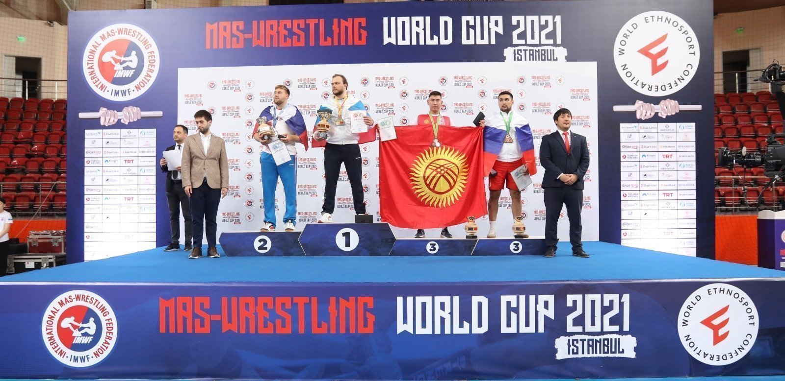Для церемонии награждения был построен красивый подиум. Наградная атрибутика была как всегда уникальная. Медалей аж по три единицы каждому призеру - одна за этап Кубка мира, другая за Чемпионат Европы по мас-рестлингу и третья с логотипом Международной федерации мас-рестлинга в честь десятилетнего юбилея.